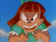 Curiously, on a few occasions, Elmyra is shown to be bald like her inspiration and wearing a wig (although, whether or not she is really bald or if this is simply cartoon humor at its most absurd is up for debate). This danger is balanced by her complete and utter gullibility. Her abject stupidity is pocked with occasional instances of cleverness and her character is toned down as needed. Buster Bunny and Babs Bunny explain in the series' debut that Elmyra is a pushover — unlike Montana Max — but that they need nominal "villains" to pitch their series. This is a nod to the original Looney Tunes shorts, in which Yosemite Sam (the basis for Montana Max) was created due to the fact that Elmer J. Fudd was seen as too easy and mild-mannered to be an effective enemy for Bugs Bunny.