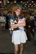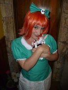 Elmyra is a young, redheaded female human, who wears a white pleated skirt, a light blue blouse with white collar and frills, a light blue bowed ribbon in her hair that has an gerbil's skull in the middle, black strapped Mary Jane shoes and white socks. She attends Acme Looniversity and lives in Acme Acres. She also serves as the school nurse.