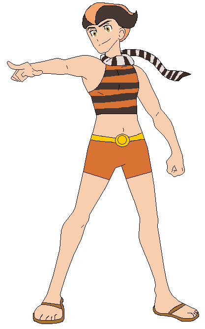 Slender, fair skin, orange and black hair, yellow eyes, black and white striped scarf, orange and black striped tank, yellow belt, orange shorts, and brown sandals.