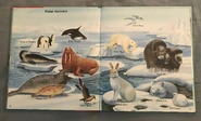 The polar bear (Ursus maritimus) is the largest living land carnivore, with adult males growing up to 2.6 meters in length. The most well known of all bears, the polar bear is immediately recognizable from the distinctive white color of its thick fur. The only unfurred parts of the body are the foot pads and the tip of its nose, which are black, revealing the brown color of the skin underneath the pelt. The neck of the polar bear is longer than in other species of bears, and the elongated head has small ears. Polar bears have large strong limbs and huge forepaws which are used as paddles for swimming. The toes are not webbed but are excellent for walking on snow as they bear non-retractable claws which dig into the snow like ice-picks. The soles of the feet also have small projections and indents which act like suction cups and help this bear to walk on ice without slipping. Females are about half the size of males, although a pregnant female with stored fat can exceed 500 kilograms in weight. Polar bear cubs weigh up to 0.7 kilograms at birth. They look similar in appearance to adults, though they have much thinner fur. With an incredible sense of smell, the polar bear is able to detect prey nearly a kilometer away and up to a meter under the snow. It is symbolized as the national animal of Greenland.